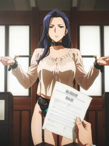 ボンデージスプレーダーアーム、秘書3、白いブラウス、ふんわりフリル付き前側ブラウス、ロングスリーブ、黒いスカート、レザーのカラー、茶色の髪、ウェービーなヘアスタイル、ナチュラルメイク、オフィスシーン、木製のデスク、緑のフレームのガラスパネル、温かい照明、室内シーン、