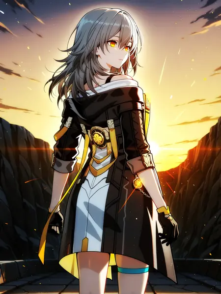 Stelle提示词:1girl, 长发, 灰发, 黄眼睛, 齐刘海, 发丝遮眼