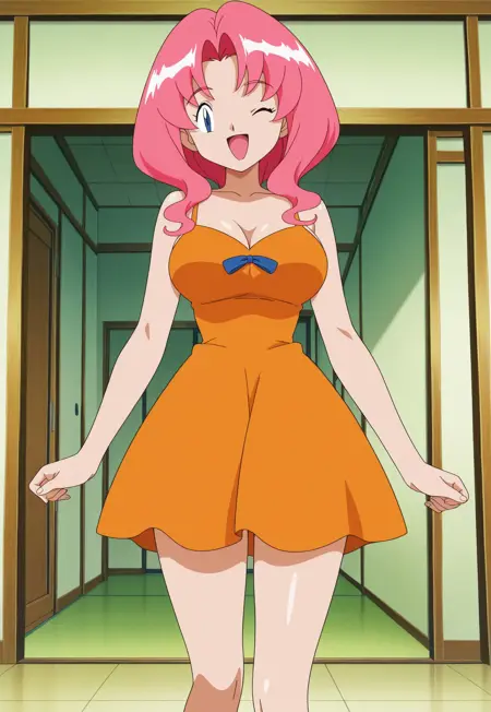 使用标签如 " pokemon lily, pink hair, blue eyes, 1990's (style), orange dress"