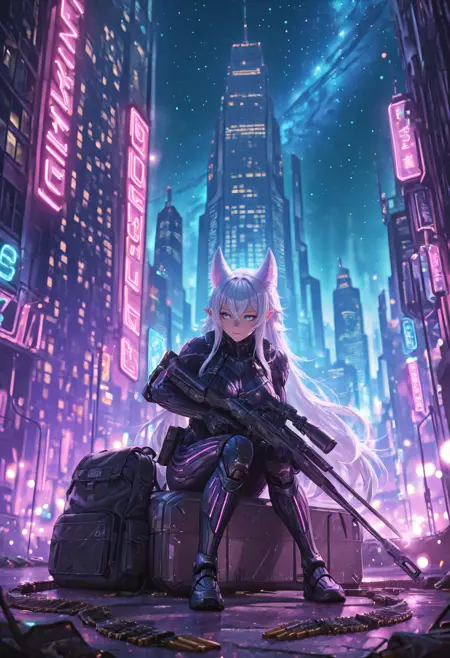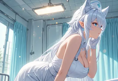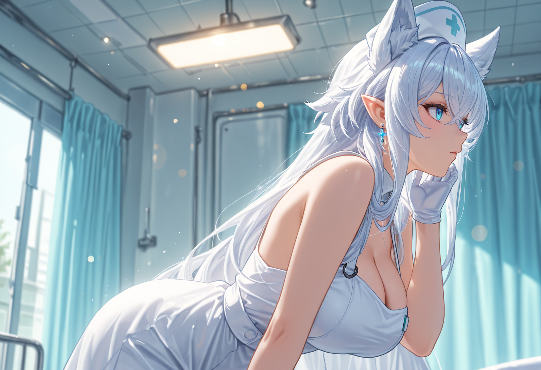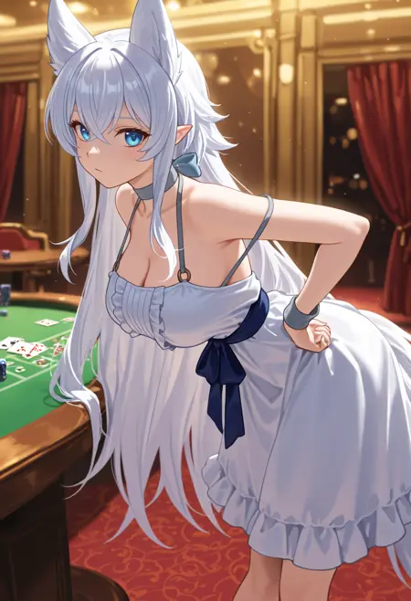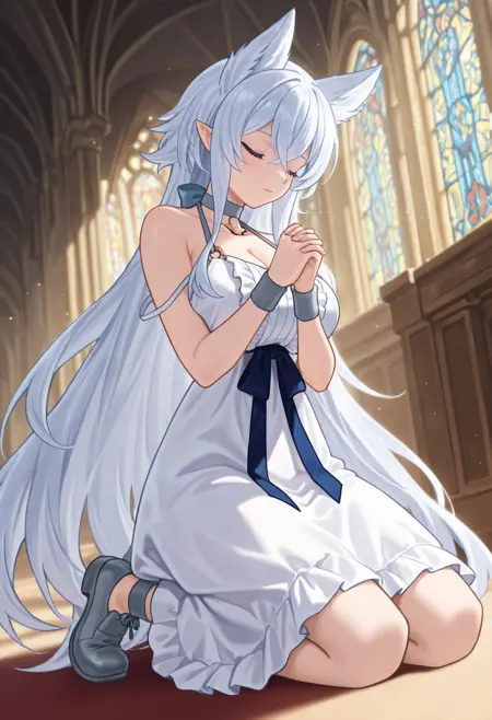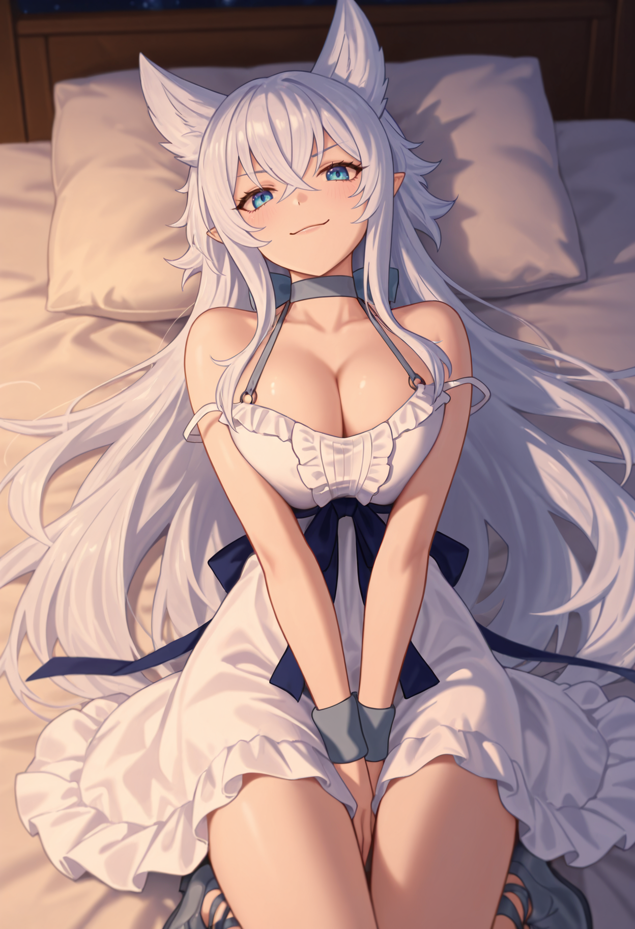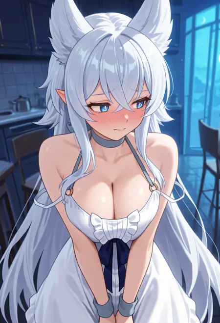 fenrysxl、ウルフガール、ウOLF耳、青い目、白い髪、動物の耳、追加の耳、尖った耳、目の間の髪、交差した前髪、長いサイドロール、非常に長い髪、アニメ風カラー、アニメのスクリーンキャプチャ