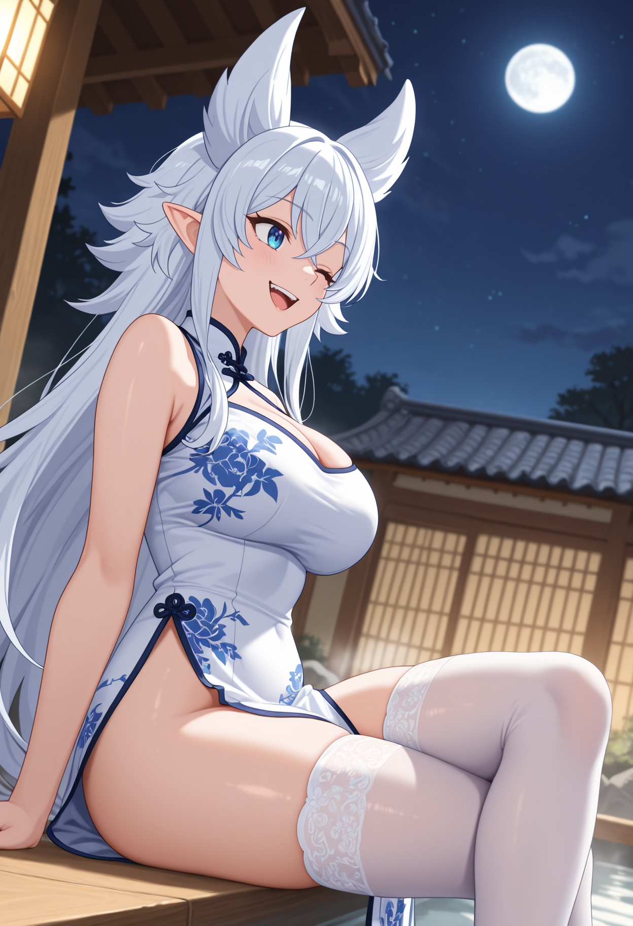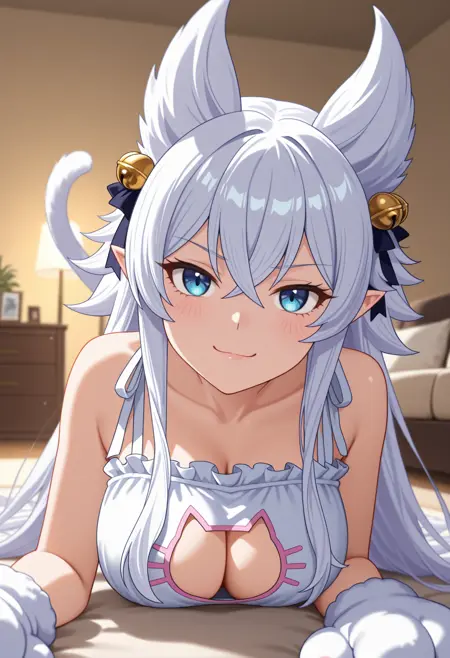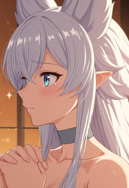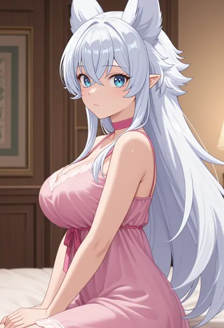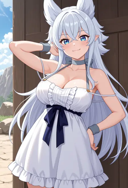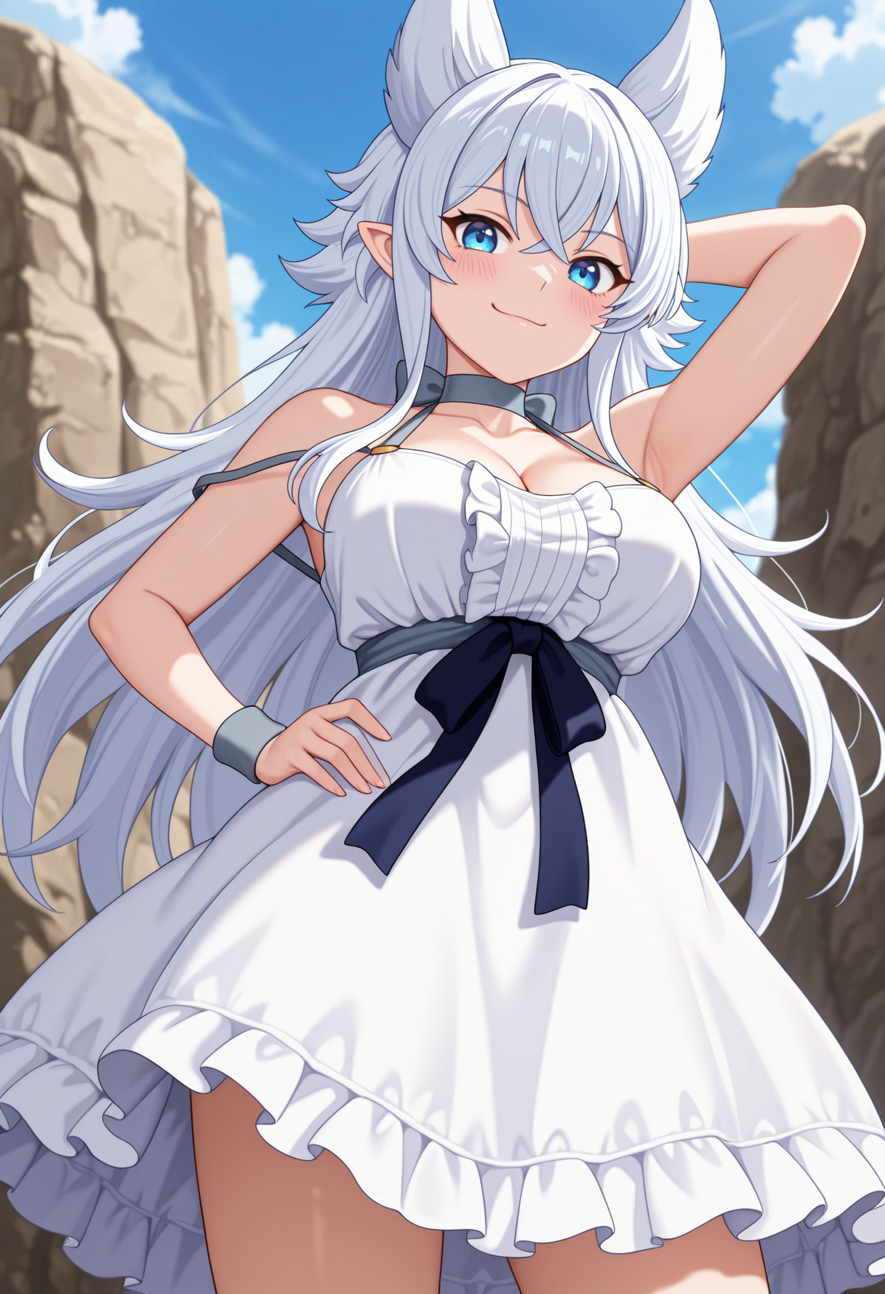 fenrysxl, wolf girl, wolf ears, blue eyes, white hair, animal ears, extra ears, pointy ears, hair between eyes, crossed bangs, long sidelocks, very long hair, anime coloring, anime screencap