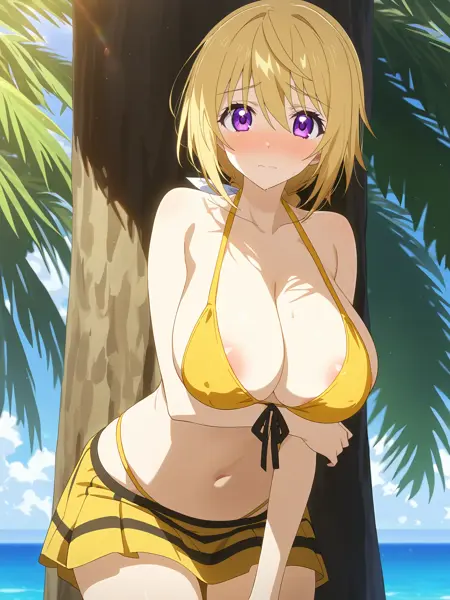 For The iconic bikini: braided ponytail, ankh necklace, yellow bikini, striped bikini skirt