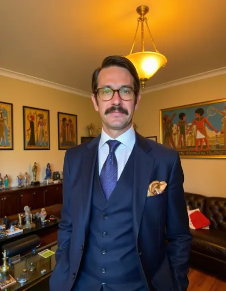 안경을 쓰고 콧수염이 있으며, 무늬 있는 넥타이를 매고 파란 정장을 입은 남자의 사진. 이집트 테마의 예술 작품과 조각상으로 장식된 거실에 자신감 있게 서 있어, 배경에는 가죽 소파와 황금색 천장 조명이 따뜻한 빛을 비추고 있음, 사이키델릭 패션 스타일로
