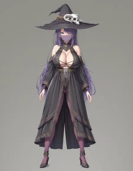 mai_gpf3,long_hair,purple_hair,blue_eyes,hair_over_one_eye,large_breasts,witch_hat,skull,veil,black_dress,cleavage,bare_shoulders,detached_sleeves,bridal_gauntlets,purple_pantyhose,high_heels