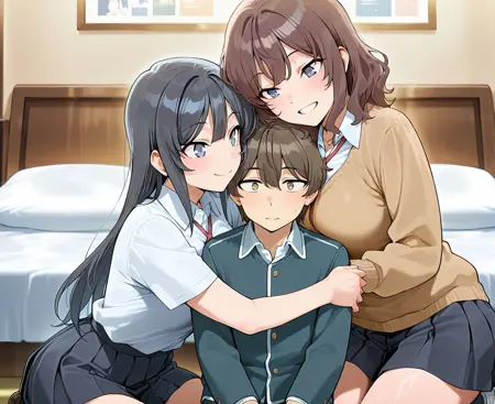 身長差、座っている、複数の女の子、胸を押し付ける、女の子のサンドイッチ,