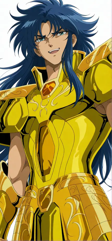 触发词:,kanon,蓝发,长发,绿眼,铠甲,金色铠甲,复古艺术风格