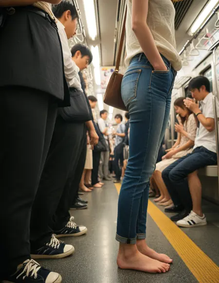 아름다운 여성이 기차 안에서 당신 앞에 서 있다.