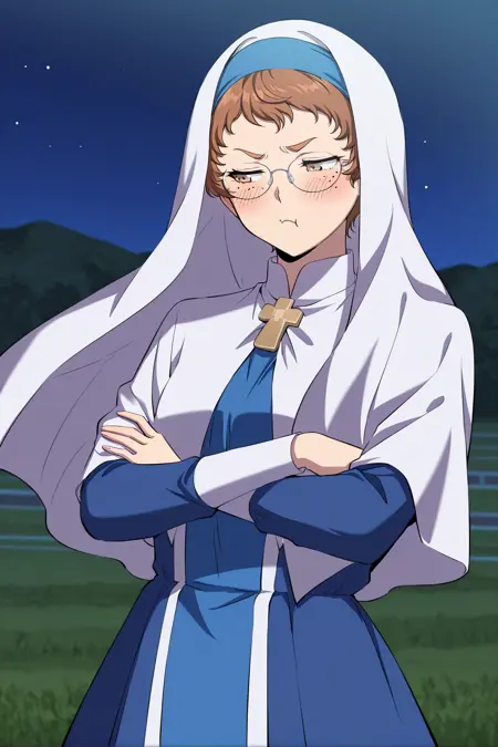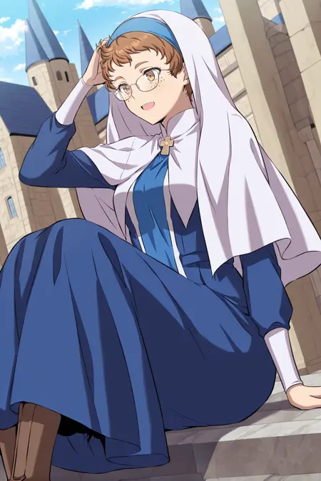 Lena, 1girl, solo, brown eyes, short hair, brown hair, wavy hair, short bangs, hair between eyes, glasses, white veil, blue headband, freckles, light brown skin,