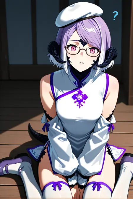 ocCasterDress,白色中国风连衣裙,露肩,白色贝雷帽,眼镜,CasterSleeves,骨盆帘,侧开叉,(shisui_大腿袜),紫色玛丽珍鞋