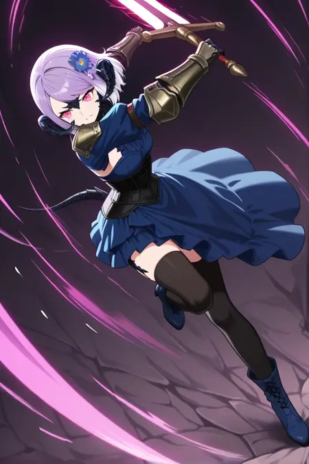 OCTank,发饰花,盔甲,蓝色连衣裙,护腕,手套,紧身胸衣,黑色大腿袜,蓝色高跟靴,交叉绑带鞋