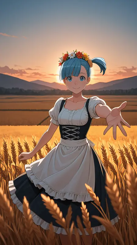 miu_mhv, 短发, 蓝发, 侧马尾, 短马尾, 侧梳刘海, 黄色发圈, 蓝眼睛, 蓝色耳环, 裸露肩膀, 无袖连衣裙, 浅蓝色连衣裙, 深蓝色裙子, 多色连衣裙, 深蓝色露肩领口, 单袖, 浅蓝色袖子, 浅蓝色裤袜, 羽毛胸针, 浅蓝色肘部手套, 单手套,