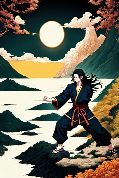 This Lora is a bit strange. Without adding a background description, the character will become a martial arts action. You can do scenery, character movements, or fusion.