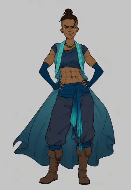 彼女の衣装は、「アームラップ、ベスト、ローブ、お腹、腹筋、青いサラシ、ブーツ、パンツ」というタグで学習させました。生成時に杖や武器を表示したくない場合は、それらを否定的なタグとして指定してください。