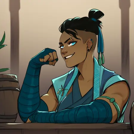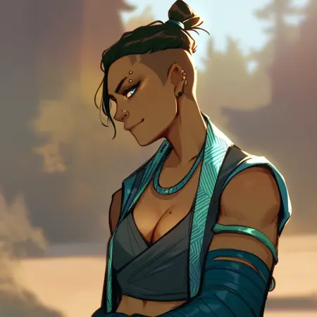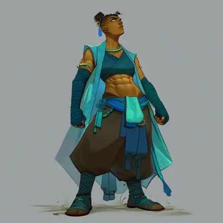 她的服装训练使用了以下标签:“臂缠、背心、长袍、露脐、腹肌、蓝色缠腰布、靴子、裤子”。如果你不希望生成时出现法杖或武器,请将它们加入负面提示中。