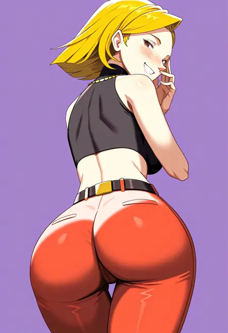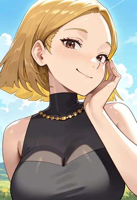 키워드는 beautyrse이며, 기본 옷차림으로는: 금발 머리, 단발, 갈색 눈, 검은 크롭탑, 금색 목걸이, 빨간 바지, 벨트를 사용하세요.