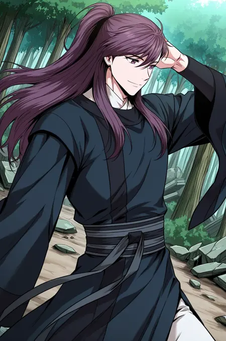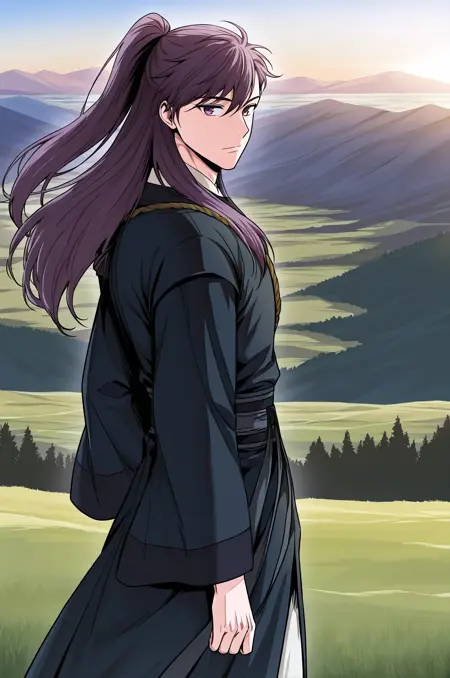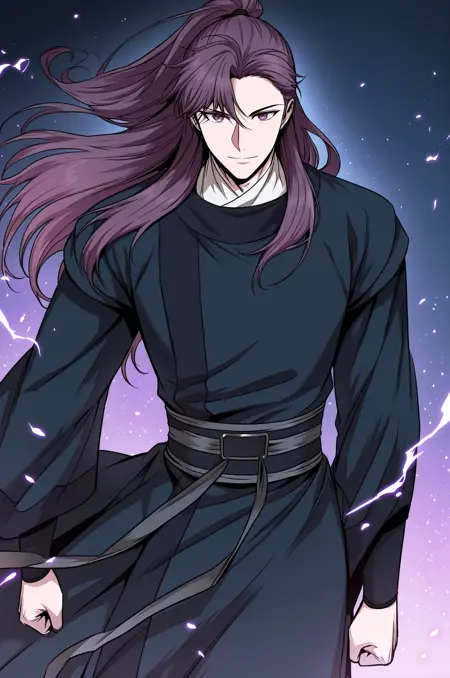 Cheon, 1boy, solo, purple eyes, purple hair, long hair, long bangs, side bangs, hair between eyes, tied back, high ponytail,