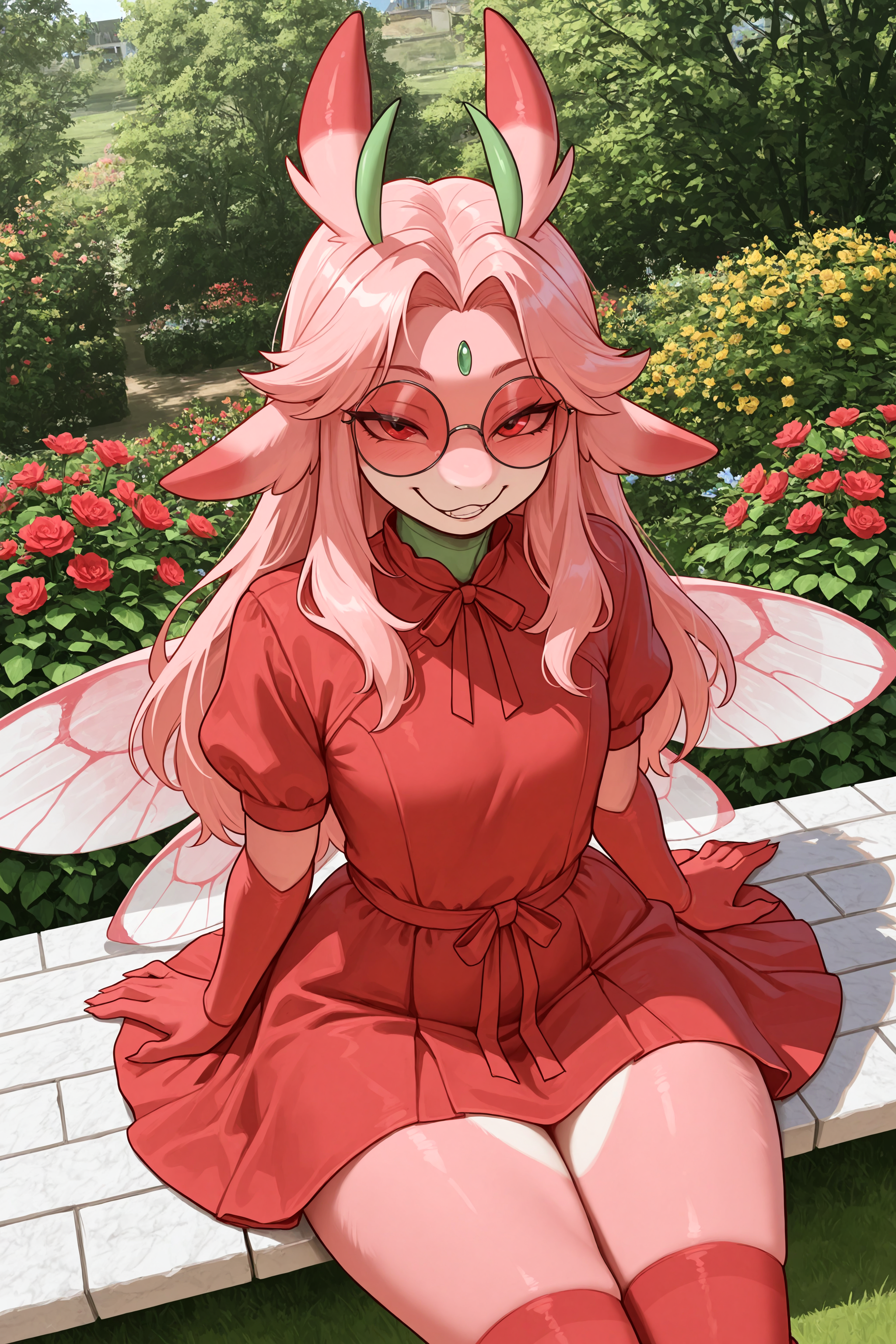 선택적 태그: male, arthropod, pink body, red sclera, pink long hair, green forehead jewel, green antenna, hands, insect wings