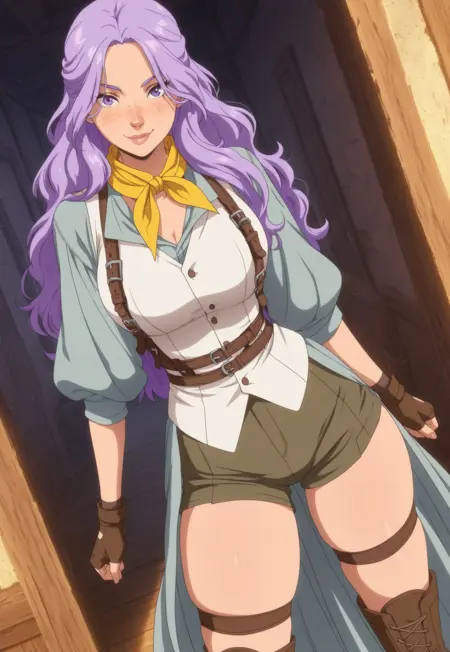 그녀의 의상을 얻기 위해 사용한 태그는 "노란 스카프, 베스트, 하네스, 부츠, 손가락 없는 장갑, 시안 드레스"입니다.