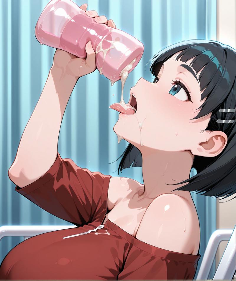 머리 위로 인공 질을 들어 올림, 정액 마시기,