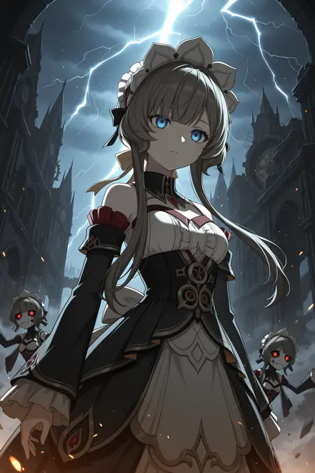 タグ: sandr0ne、茶色の髪、ドレス、取り外し可能な袖、長い髪、裸の肩、長い袖、青い目、フリル、胸、黒いドレス、手袋、白い手袋、メイドの頭飾り、閉じた口、短い髪に長い髪の束、頭飾り、乳首の露出