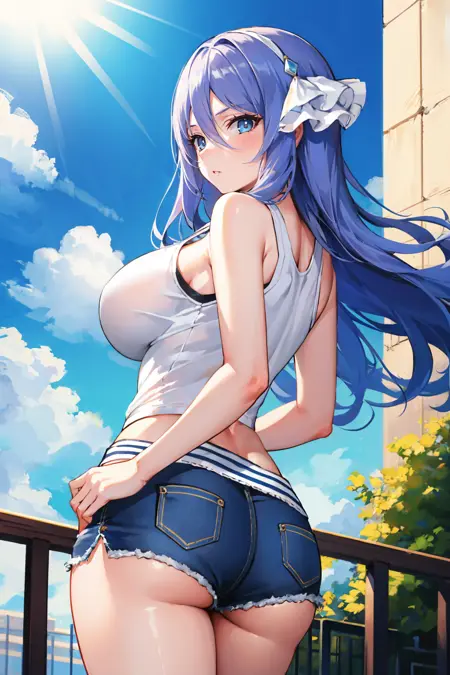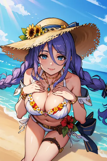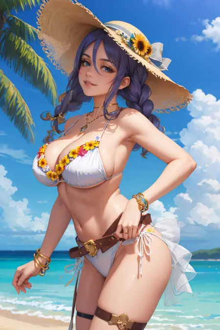 여름 알터 에고를 원할 경우 "sumshizuru, straw hat, twin braids, white bikini, necklace, flower bracelet, belt, thigh strap, sunflower"를 추가하세요.