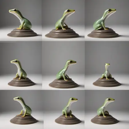 9anglesは、プロダクトデザイン・生成・表示のプロセスにおいて、同じ潜在空間を活用し、1枚の画像内に同じプロンプトから生成された9つの異なる角度/ポーズ(場合によっては同じポーズ)の画像を表示することで、2Dから2.5D/3Dへと補助する無料モデルです。また、1枚の画像の生成にかかる時間で9枚の画像(1枚の中に収められた)を生成できるため、新しい創造物やコンセプトの生成を高速化できます。