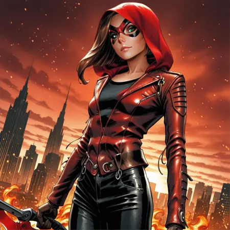 스피디 복장: sp33dy-costume, 빨간 재킷, 후드 재킷, 검은 바지, 검은 장갑, 검은 셔츠, 도미노 마스크, 빨간 마스크, 후드, 벨트, 지퍼 열림