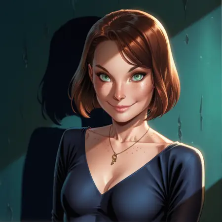 초록색 눈, 작은 가슴, 갈색 머리, 단발, 주근깨, 입술, 비대칭 머리