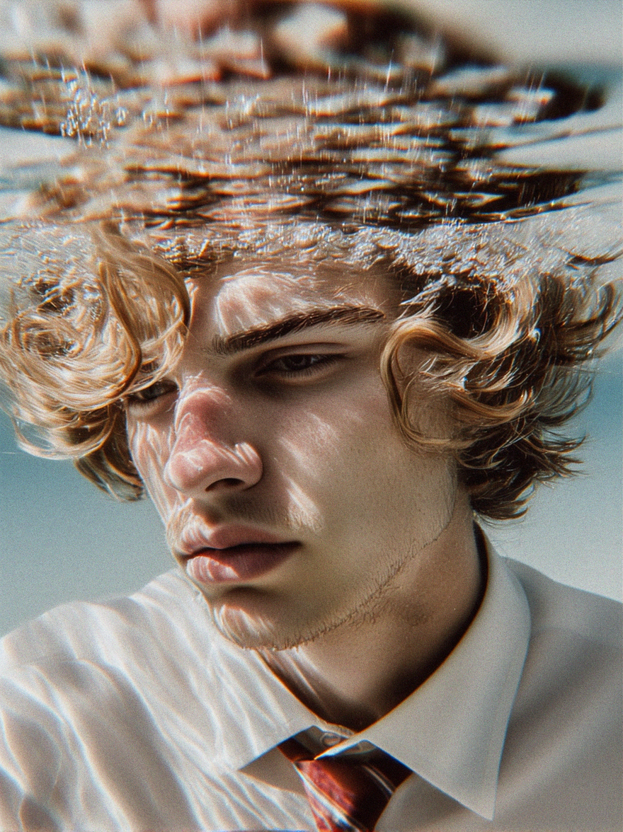 첫 번째 버전. 꿈같고 왜곡되며 초현실적인 스타일의 수중 사진.