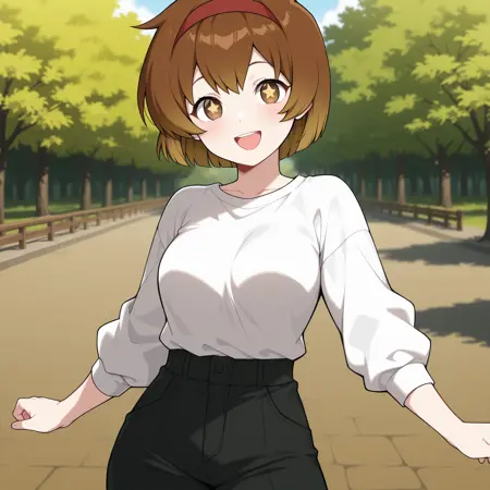 MalkuthLC, short hair, brown hair, brown eyes, medium breasts, red hairband, armband, business suit, pants,