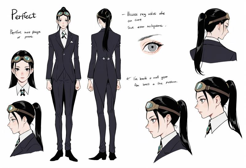 替代服装: 马尾辫,护目镜,护目镜戴在头上,珠宝,正式,胸针,西装,西装裤,夹克,长袖,纽扣,衬衫,白衬衫,有领衬衫,裤子,黑色裤子