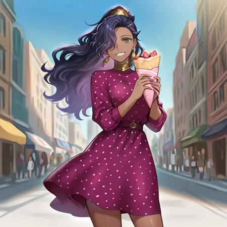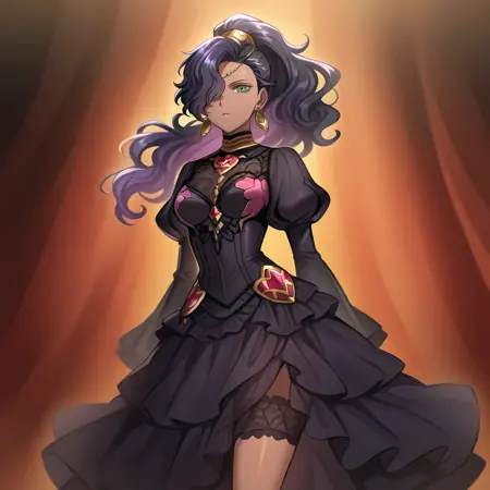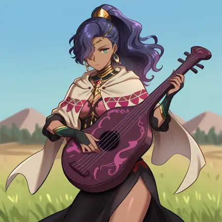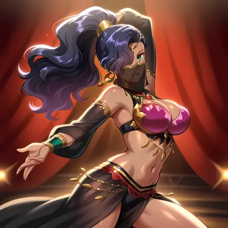 추가: 긴 머리, 검은 피부, 검은 피부를 가진 여성, 녹색 눈, 검은 머리, 보라색 머리, 꼬리머리, 한쪽 눈 위의 머리카락, 보석, 귀걸이, 관모, 신부용 장갑, 무용가, 아라비안 복장, 분리된 소매, 고리 귀걸이, 망토, 스카프