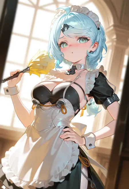 그녀의 외모 태그: 1girl, solo, long hair, medium breasts, hair ornament, ahoge, hairclip, aqua eyes, light blue hair, swept bangs, braided ponytail,