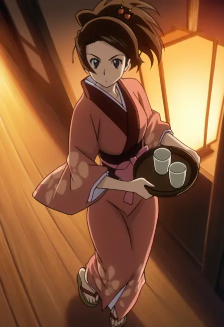 kasumi fuu,1girl, solo, brown hair, brown eyes, ponytail, japanese clothes, kimono, hair ornament, sandals, japanese sandals, tray, cup