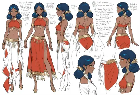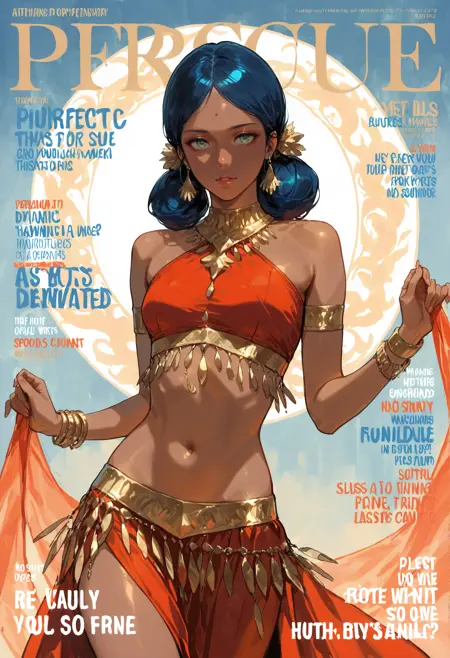 Harem dress: long hair,twintails,hair ornament,jewelry,midriff,bracelet,earrings,bare shoulders,breasts,small breasts,armlet,skirt,red skirt,halterneck,crop top,harem outfit,tattoo