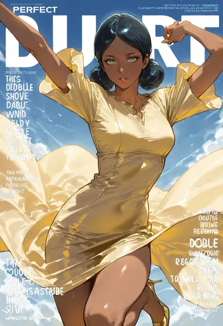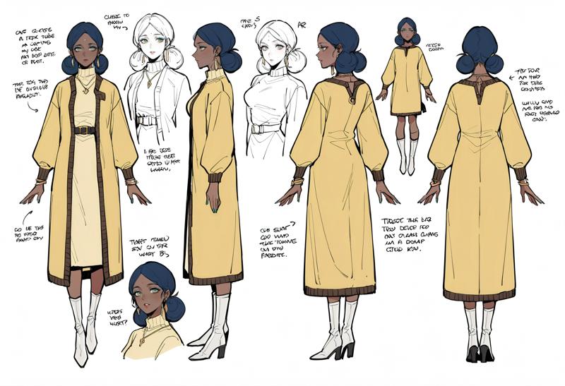 Causal Outfit: makeup,facial mark,forehead mark,jewelry,charm (object),necklace,earrings,bracelet,breasts,nail polish,open clothes,coat,sweater,turtleneck,turtleneck sweater,long sleeves,belt,dress,yellow dress,skirt,boots,white footwear,high heels,high heel boots,alternate costume,fashion,casual