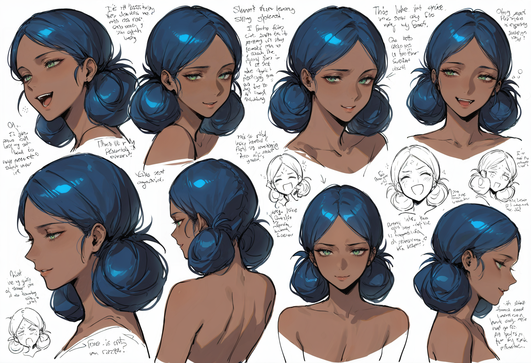 Appearance: 1girl,dark skin,dark-skinned female,green eyes,blue hair, black hair,short hair,hair bun,double bun,bangs,parted bangs