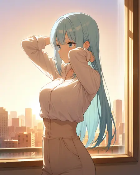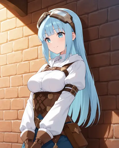 Iz, 연한 파란 머리카락, 연한 파란 눈, 긴 머리, 1girl, 싱글, 장갑, 파란 머리카락, 고글, 머리에 고글, 파란 눈, 미소, 갈색 장갑, 가슴, 서 있음, 닫힌 입, 긴 소매, 돌 벽, 팔 밴드, 벽돌 벽, 벨트, 중간 크기 가슴, 유두 아래, 둔한 앞머리, 셔츠, 곧은 머리, 흰 셔츠