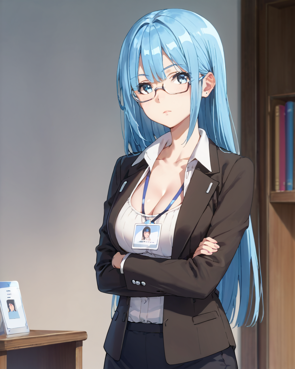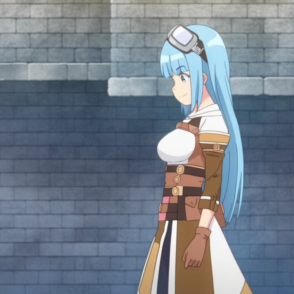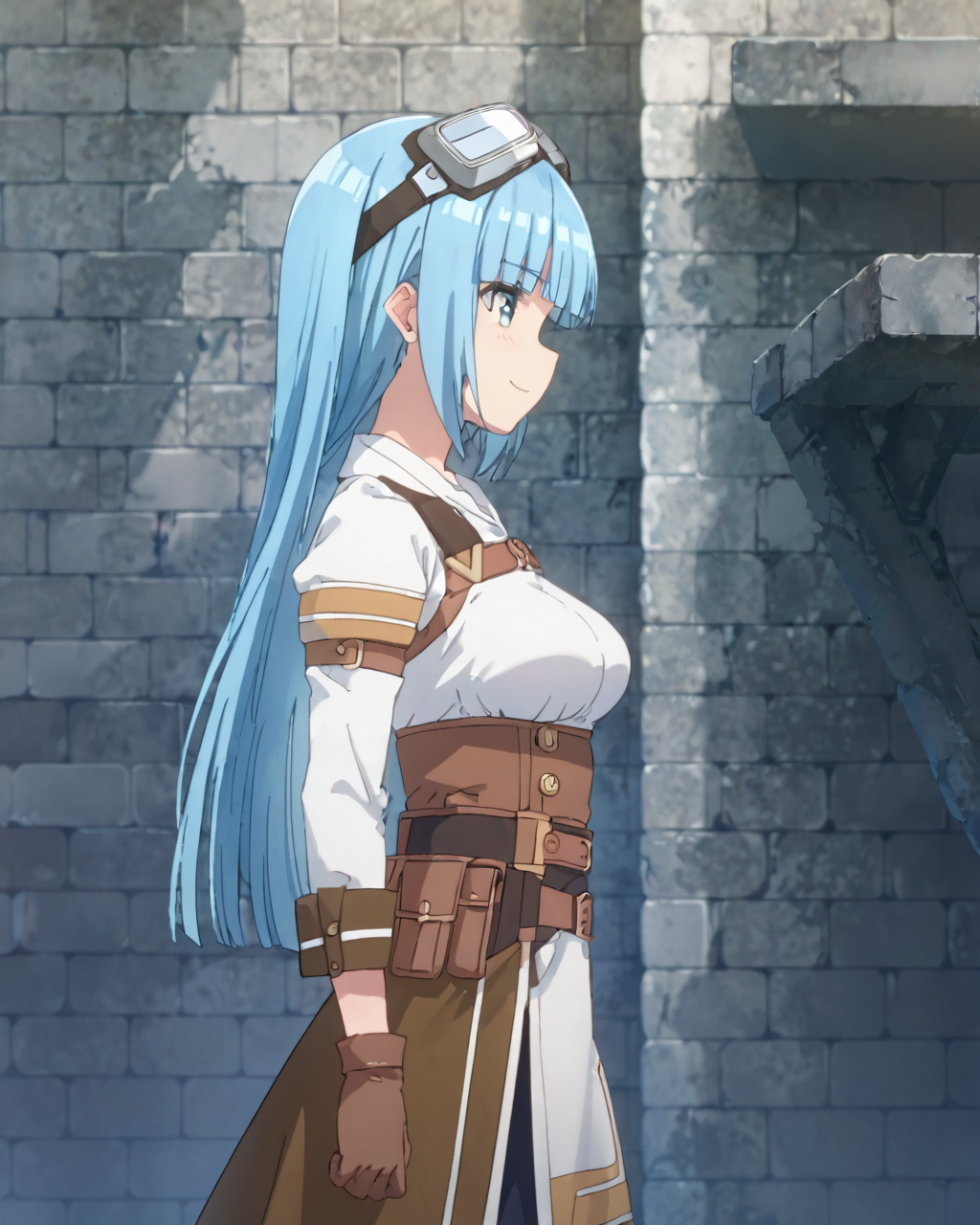 Iz, 연한 파란 머리카락, 연한 파란 눈, 긴 머리, 1girl, 싱글, 장갑, 파란 머리카락, 고글, 머리에 고글, 파란 눈, 미소, 갈색 장갑, 가슴, 서 있음, 닫힌 입, 긴 소매, 돌 벽, 팔 밴드, 벽돌 벽, 벨트, 중간 크기 가슴, 유두 아래, 둔한 앞머리, 셔츠, 곧은 머리, 흰 셔츠