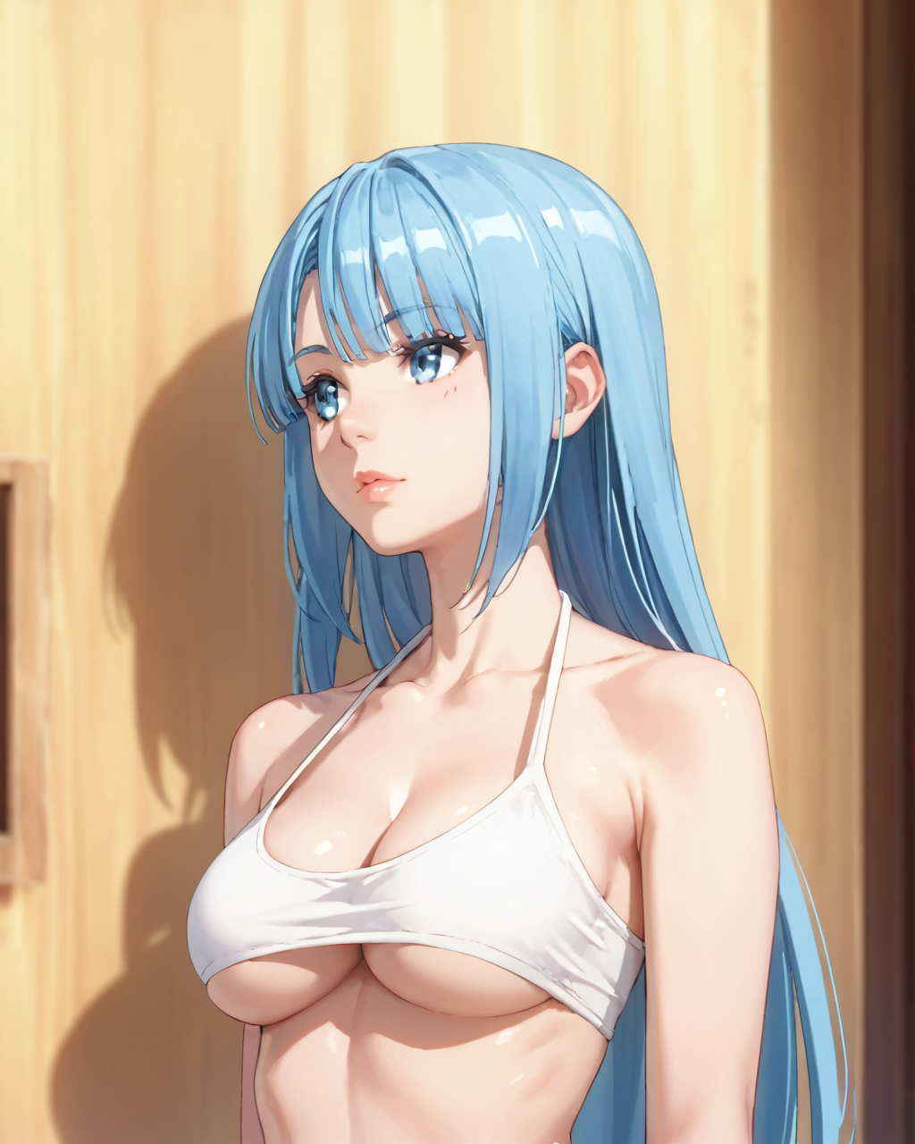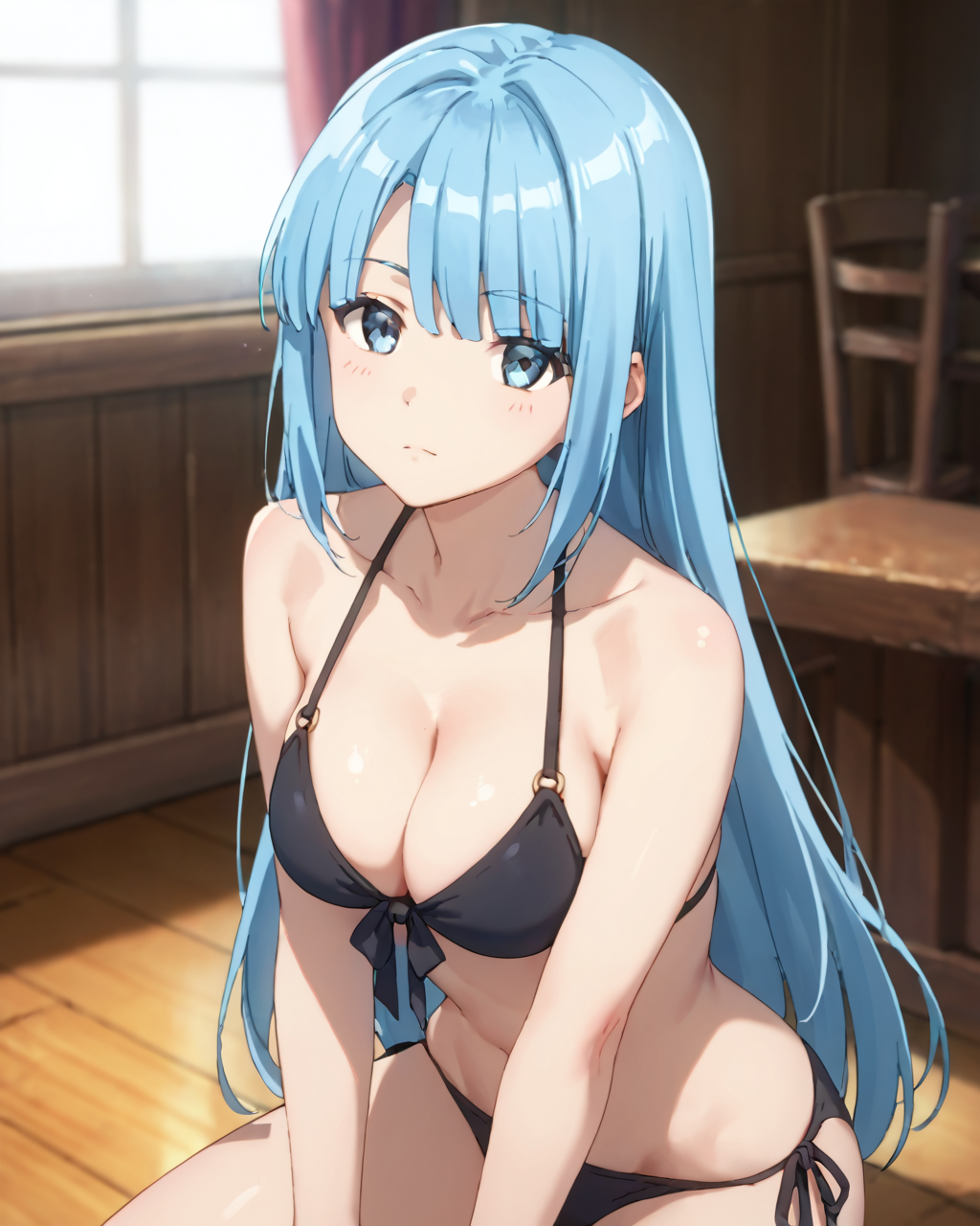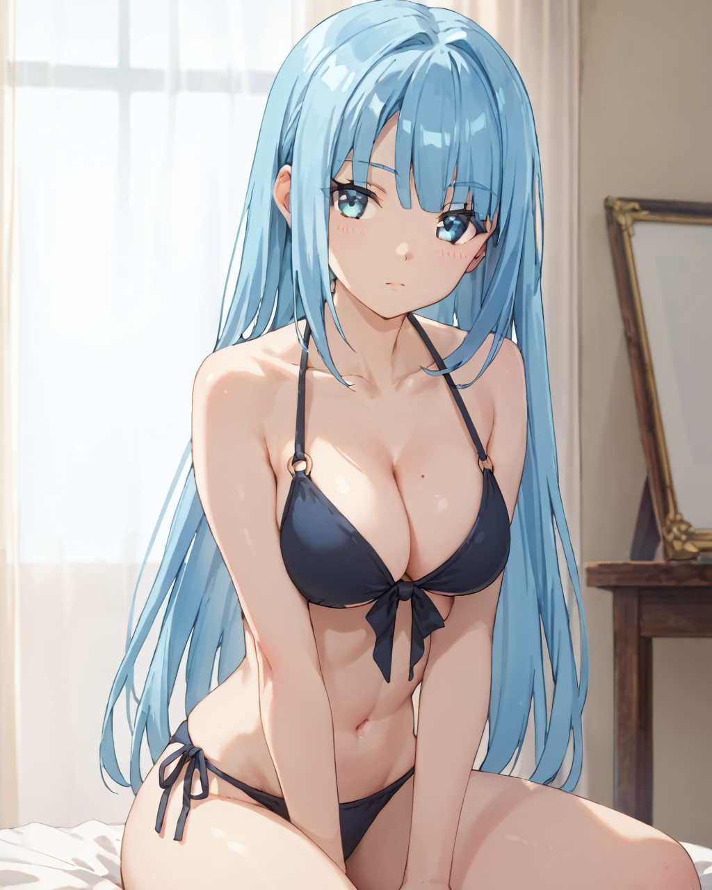 Iz, 연한 파란 머리카락, 연한 파란 눈, 긴 머리, 1girl, 싱글, 가슴, 검은 비키니, 흉부 노출, 옆 묶는 비키니 하의, 리본