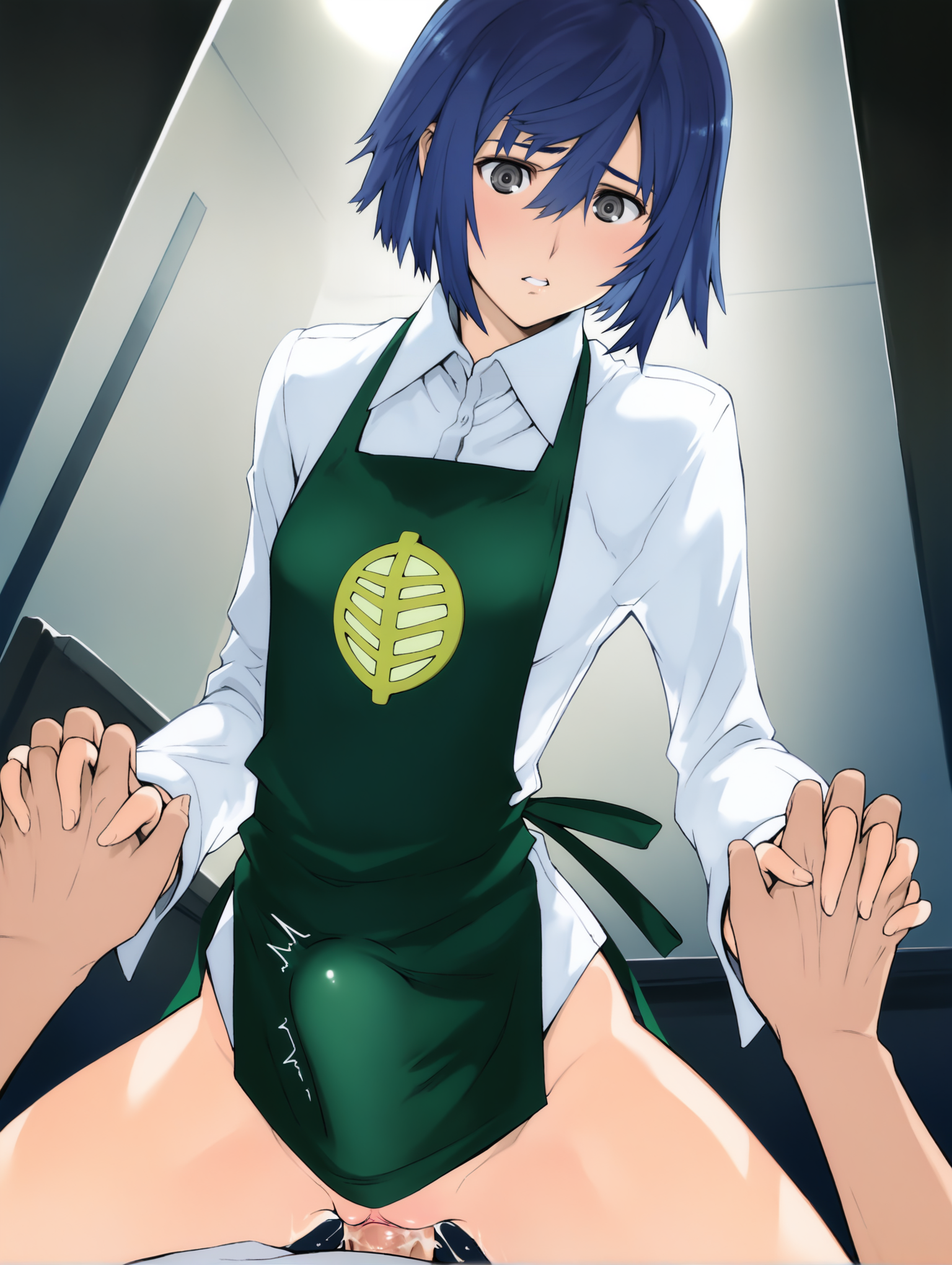 白いシャツ,カラーシャツ,長い袖,緑のエプロン,バッジ