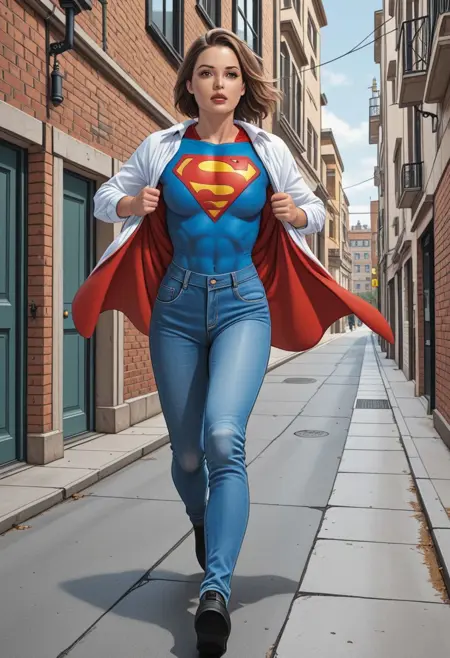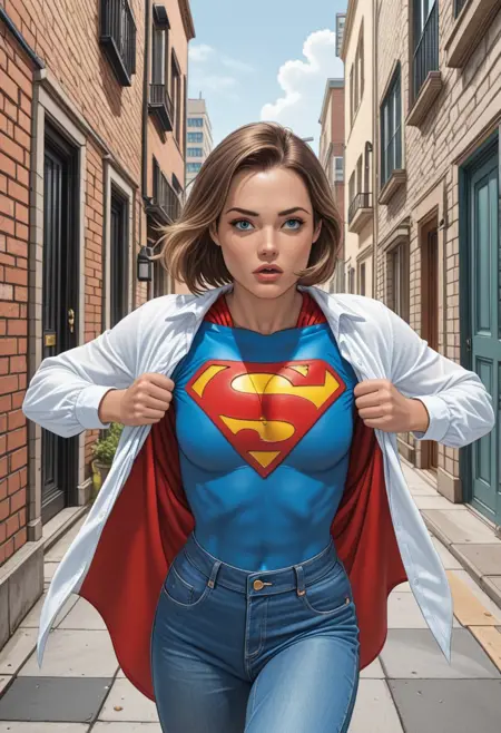 变身描述: <Linda Danvers 或 Supergirl 标签,服装描述标签>,超女战衣,超人暴露,衣物下的超级战衣,衬衫敞开,衣物敞开,裤子,裤门大开,裤子下有裙子