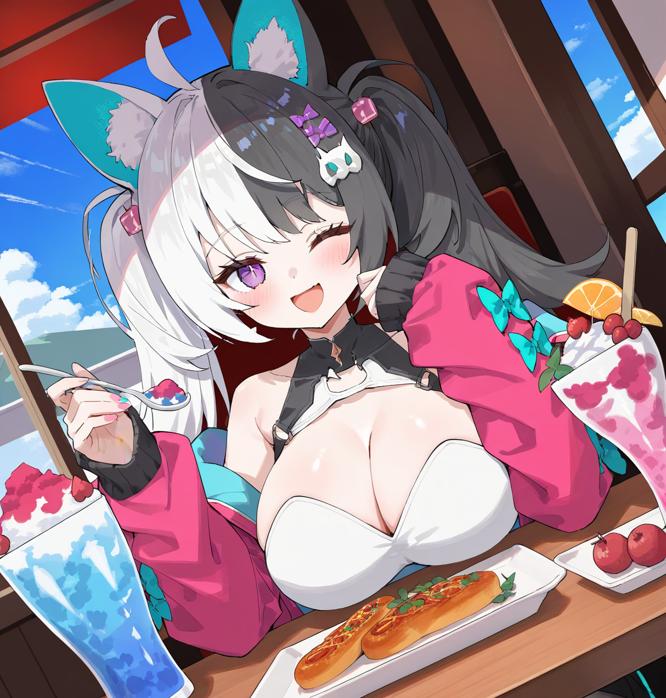 星引擎 南希露 原皮词条1girl, breasts, multicolored hair, animal ears, black hair, large breasts, white dress, dress, cleavage, jacket, tail, full body, white hair, purple eyes, ahoge, cat tail, twintails, solo, hair ornament, two-tone hair, white background, smile, cat ears, shoes, looking at viewer, black footwear, open mouth, simple background, bow, pink jacket, thigh strap, split-color hair, open jacket, fang, long hair, sleeves past wrists, open clothes, virtual youtuber