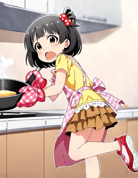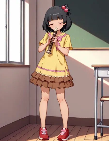 服装: 黄色衬衫,短袖,粉色蝴蝶结,格子蝴蝶结,棕色裙子,层叠裙摆,无袜,红色鞋子,