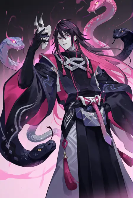 0rochi evolved, black hair, pink hair,, tassel, long hair,multicolored hair, hair between eyes, streaked hair, gloves, black gloves,wide sleeves, turtleneck, earrings, jewelry, pale skin, japanese clothes, robe