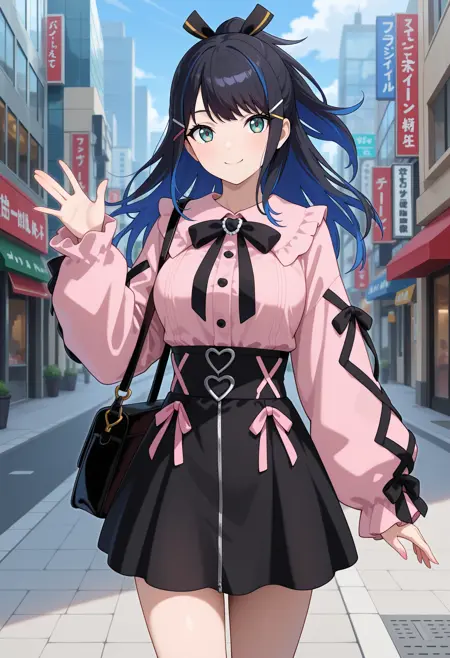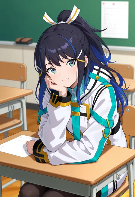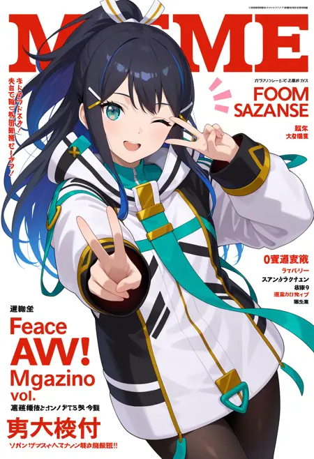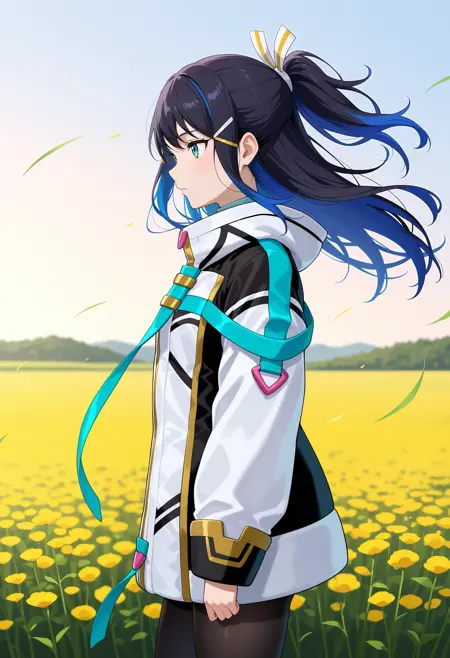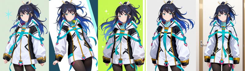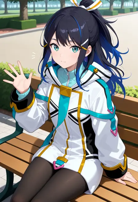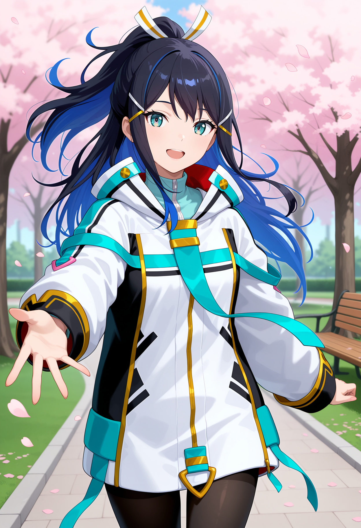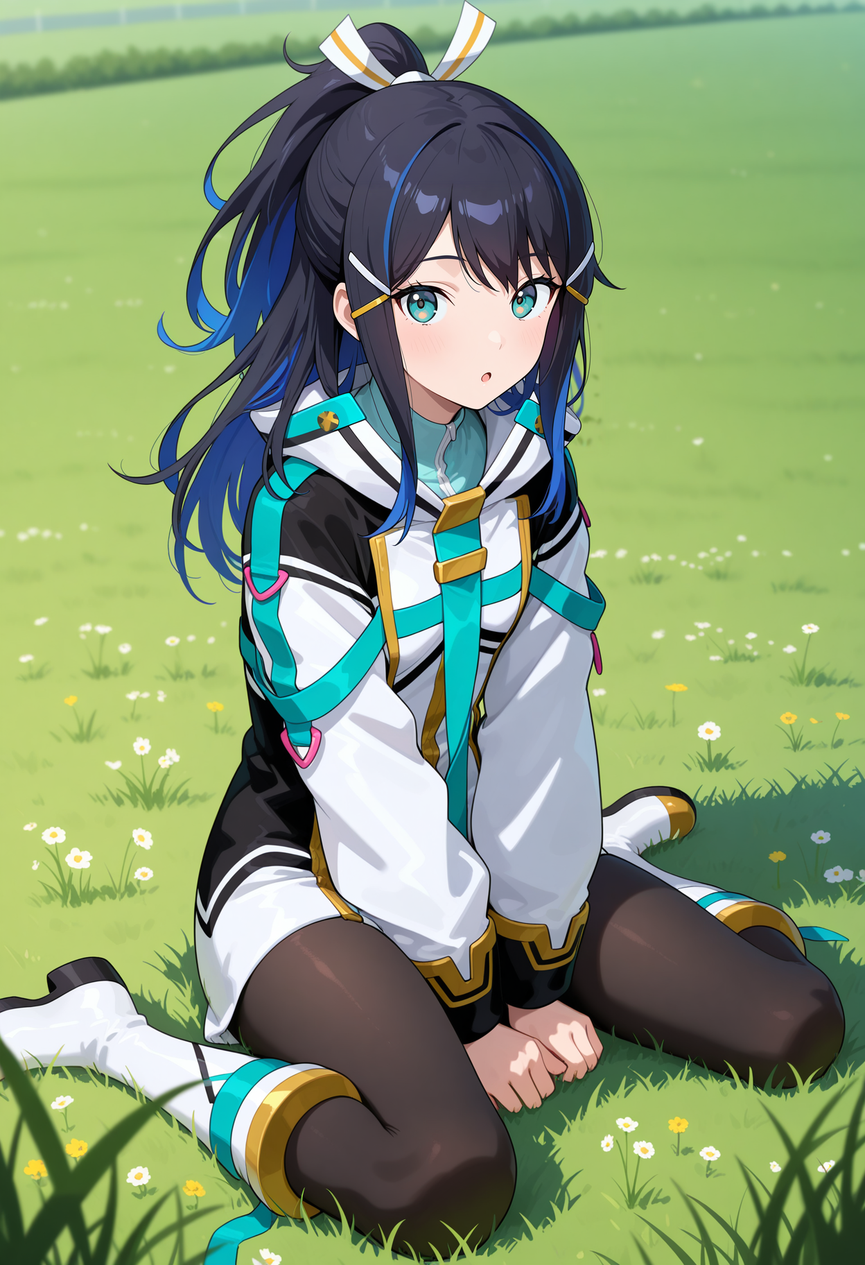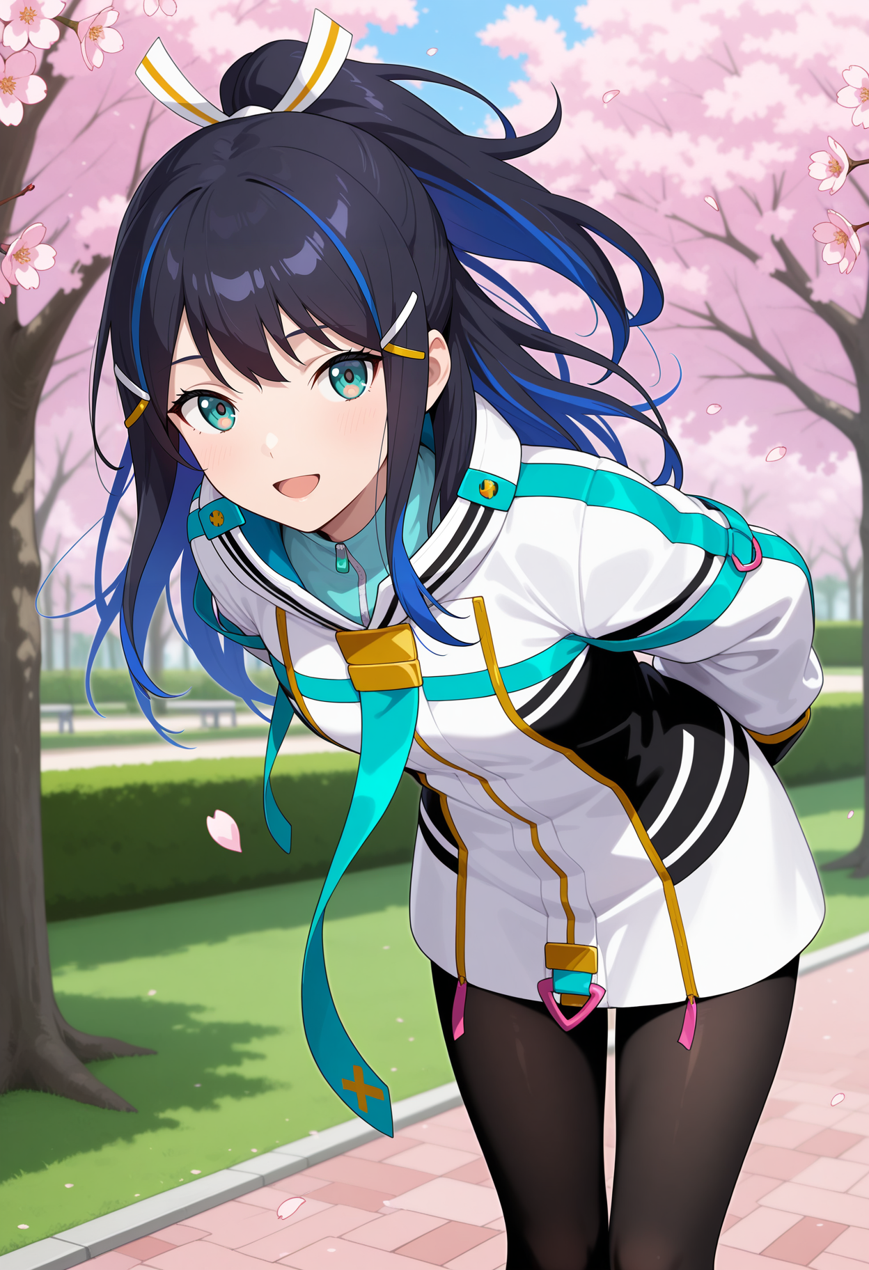 outfit1aakano, multicolored hair, black hair, ponytail, hair ribbon, hair ornament, white jacket, long sleeves, black pantyhose