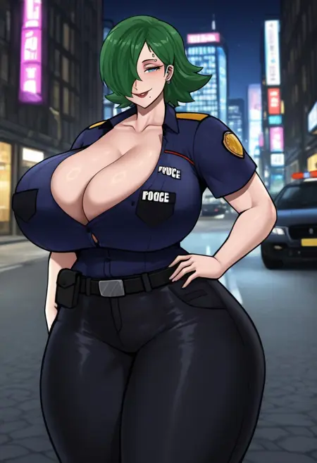 Green Hair, Short Hair, Hair Over One Eye, Blue Eyes, Mature Female, Piercing, Jewelry, Police Uniform, Policewoman, Black Pants, Belt