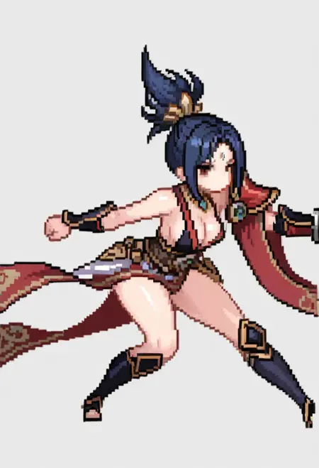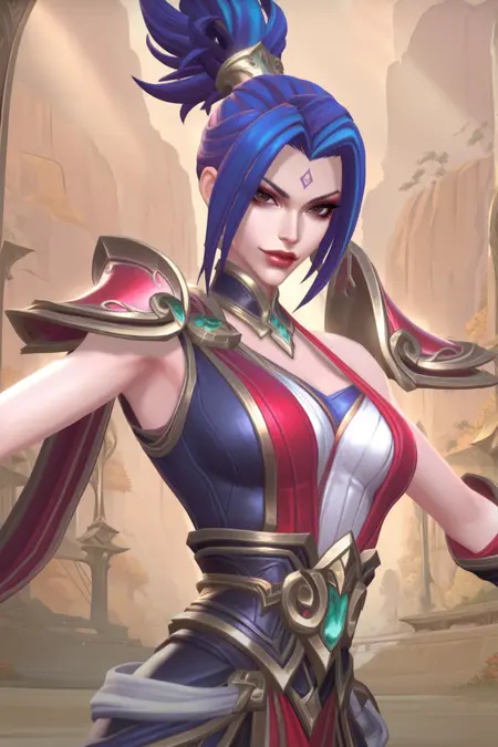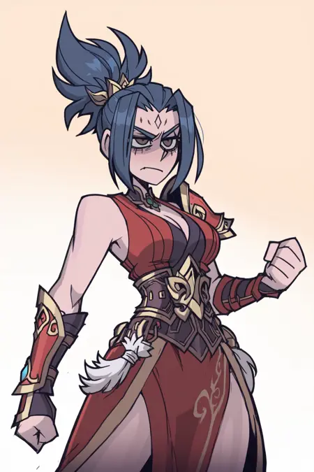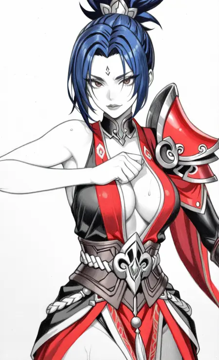 VS_ Riven, black blue hair, short ponytail, sharp brown eyes, slim body, forehead marking, slim body, sharp face, fantasy warrior outfit, red and balck armor, gold trim, single shoulder plate, thigh-high boots , armored boots,