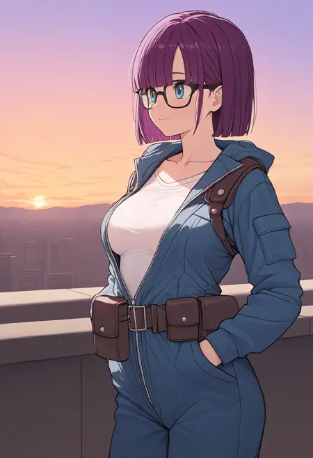 맞춤 옷차림: 보라색 머리카락, 둔한 앞머리, 단발머리, 파란 눈, 안경, 검은 프레임 안경