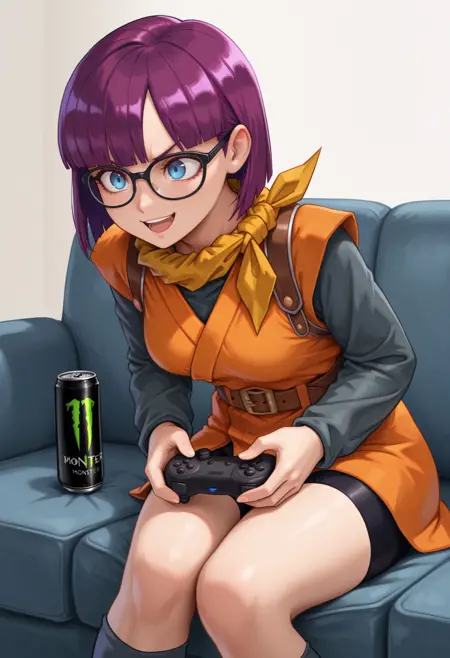 기본 외형: 보라색 머리카락, 둔한 앞머리, 단발머리, 파란 눈, 안경, 검은 프레임 안경, 헬멧, 녹색 머리 장신구, 헤드셋, 노랑색 반팔, 목에 두른 반팔, 주황색 투닉, 긴 소매, 회색 소매, 갈색 벨트, 벨트 주머니, 자전거 반바지, 검은 반바지, 회색 양말, 느슨한 양말, 갈색 부츠